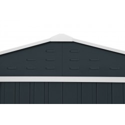 Cobertizo en color negro con bordes en blanco, dispone de tejado a dos aguas para evitar acumulaciones de basura y hojas. Las puertas son correderas sobre rail.